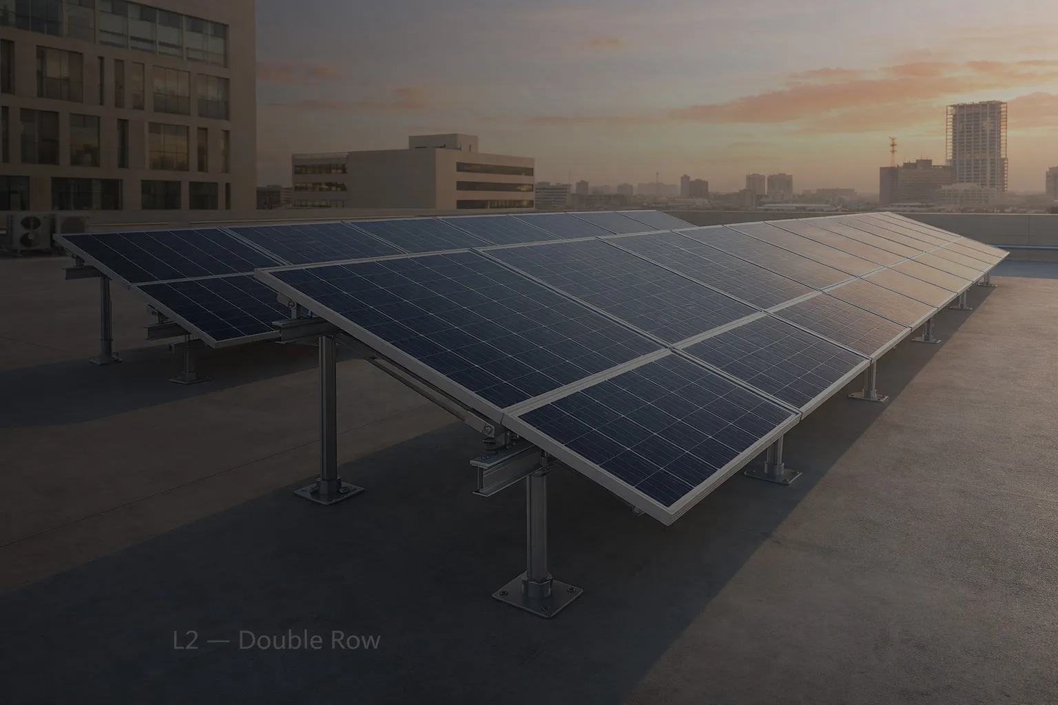 Fixed-tilt and adjustable-tilt mounting for flat rooftops, pitched roofs and open ground. Three frame types — L1, L2 and L3 — matched to panel count and structural load. Anchor bolt, driven pile or ballast fixing.